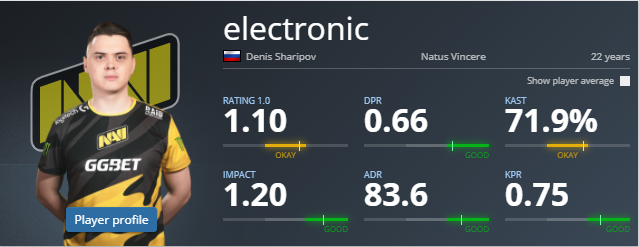 Persze Denis "electronic" Sharipov inkább AK-val és M4-gyel parádézik, ritkán veszi el az AWP-t s1mple-től, de az biztos, hogy ha nem az ukrán mesterlövész, akkor electronic cipeli a hátán a Na'Vi-t. Emlékezzünk csak vissza az ESL Pro League 12. szezonjának európai divíziójára. A Na'Vi a Heroic-kal nézett szembe az elődöntőben, electronic pedig élete mérkőzését játszotta. 54-20-as K/D aránnyal zárta a meccset, ehhez pedig egy 1.85-ös HLTV értékelés társult, amitől magasabbat korábban még sosem ért el.